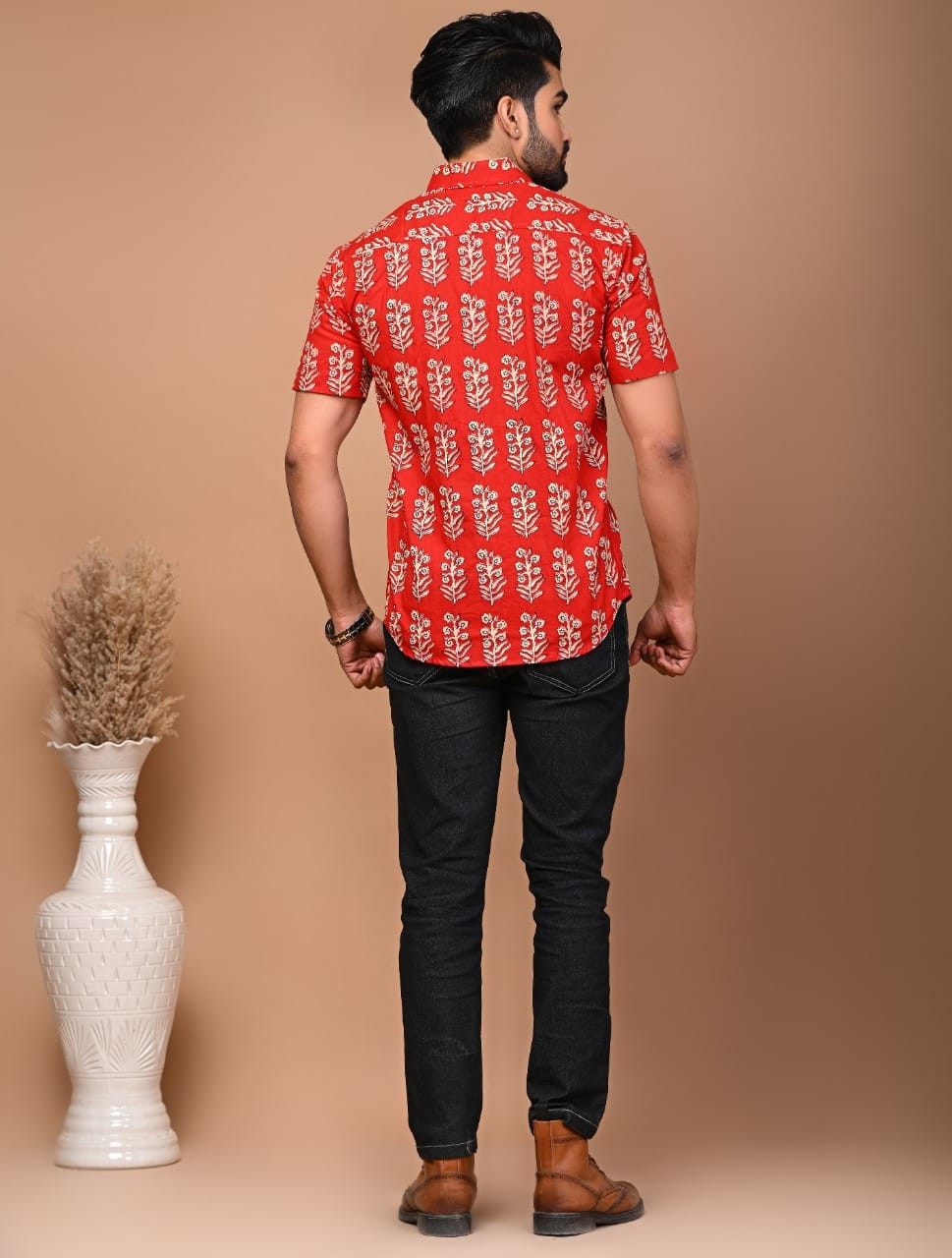 • Design & Pattern: The outfits feature intricate floral and geometric motifs in a vibrant red and off-white color palette. The pattern is applied using the traditional Indian technique of hand block printing, a process that highlights artisanal skill and results in unique designs.