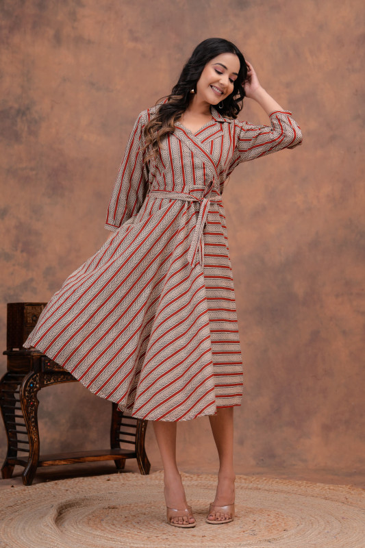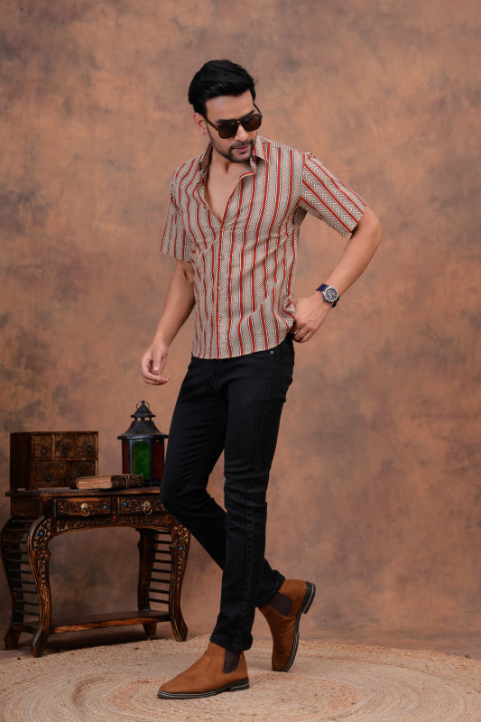 This stylish and coordinated couple's ensemble features a dynamic red, off-white, and black striped print design, crafted from a breathable cotton material. The outfit offers a contemporary aesthetic that is perfect for a variety of casual and semi-formal occasions. The fabric is lightweight and comfortable, often utilizing traditional hand block printing techniques to achieve the unique pattern. The woman's outfit is a chic A-line midi wrap dress with a V-neck, 3/4 sleeves, and a tie-up waist belt that flatters the silhouette, while the man's is a casual, short-sleeve button-down shirt with a classic collar and regular fit. This matching set is versatile for various casual occasions, from beach outings to daytime events, and creates a perfectly synchronized look for the couple