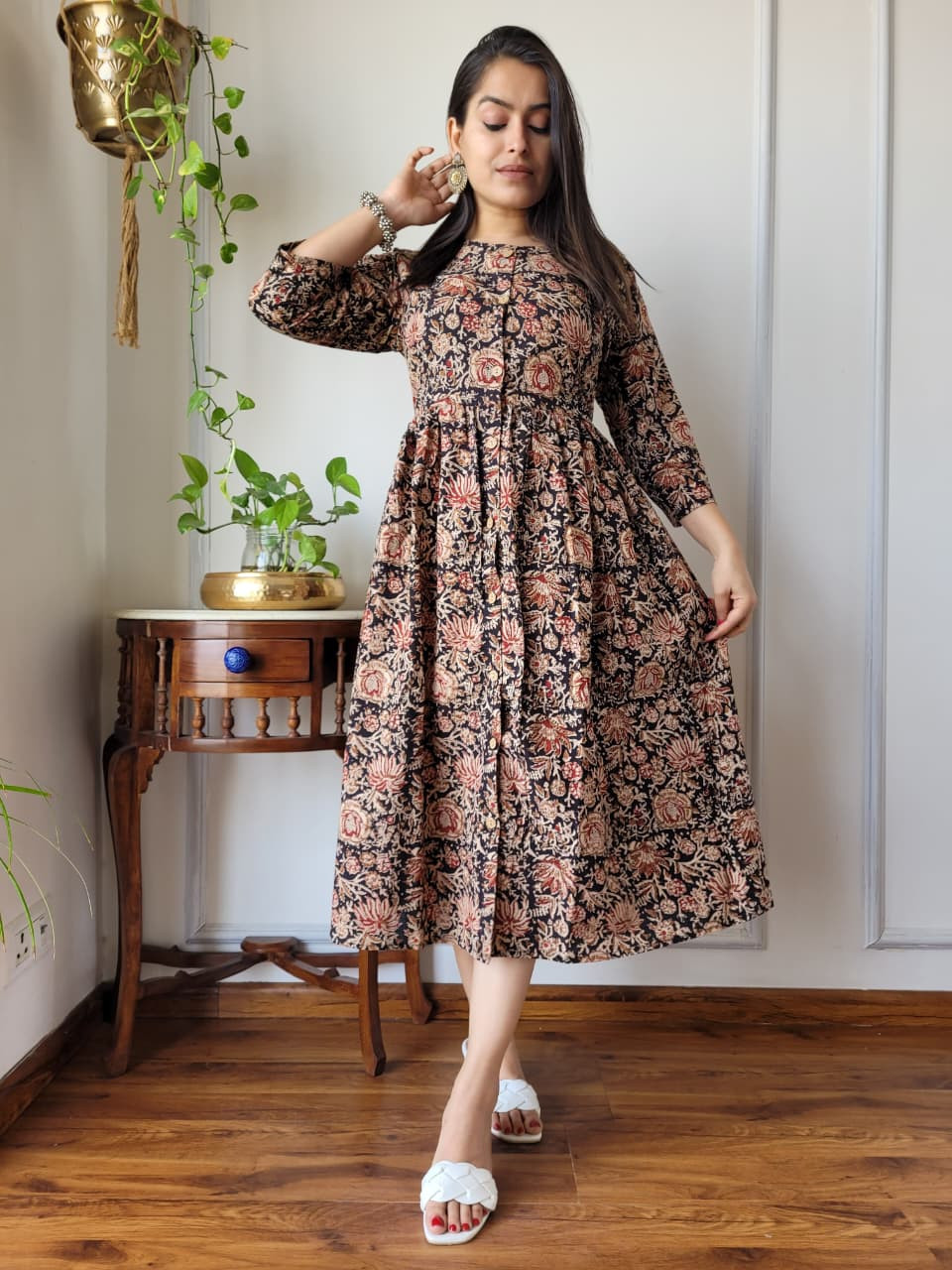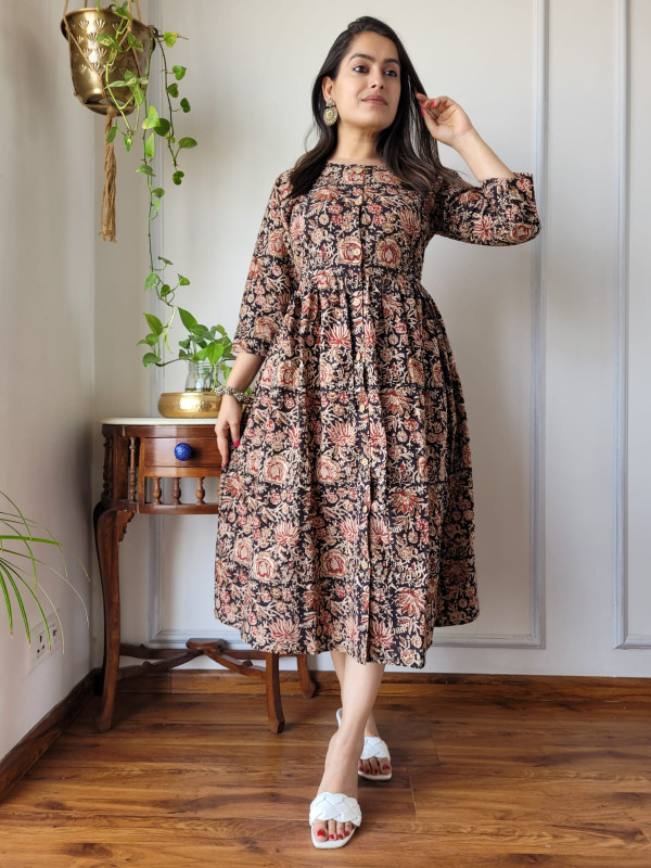 This black and beige hand block printed cotton One Piece dress is a sophisticated and comfortable garment that beautifully encapsulates traditional Indian craftsmanship in a modern silhouette. Crafted from high-quality, breathable cotton cambric fabric, it offers a soft, lightweight feel, ensuring maximum comfort for all-day wear. The base color is a deep black, adorned with intricate floral and botanical motifs in a contrasting beige or off-white hue. These patterns are created using the time-honored hand block printing technique, where skilled artisans in regions like Rajasthan use hand-carved wooden blocks and often natural dyes to stamp the fabric, ensuring each piece is unique and carries significant cultural heritage.