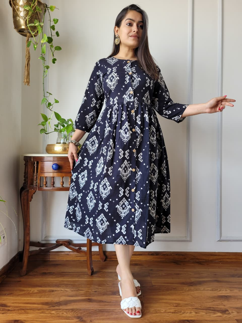This black and white Ikat print cotton A-line one piece dress is a beautiful garment that seamlessly blends traditional Indian textile artistry with a comfortable, contemporary silhouette. Crafted from 100% pure cotton cambric fabric, it offers a soft, breathable, and lightweight feel, making it ideal for all-day wear.