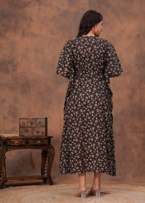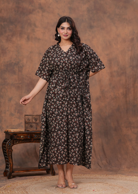 This stylish kaftan is commonly made from a soft, breathable 100% cotton fabric, which provides comfort for all-day wear. It features a loose, flowing silhouette with a V-neckline and wide, short kaftan sleeves. The kaftan has an adjustable drawstring waist to allow the wearer to customize the fit to their body shape. The deep black base is decorated with intricate floral and leaf patterns in contrasting colors like red, maroon, and beige, giving it an elegant and dramatic look. This versatile piece is ideal for various occasions, functioning well as casual wear, loungewear, or even as comfortable nightwear.
