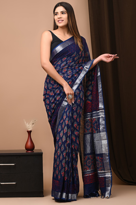This exquisite Indigo Blue Hand Block Printed Linen Saree with a Silver Border offers a perfect blend of traditional craftsmanship and contemporary style. Crafted from premium, lightweight linen fabric, this saree is designed for comfort and elegance. The body features intricate, handcrafted hand block prints in striking red and white motifs set against a deep indigo blue background. A shimmering silver zari border runs along the edges, adding a touch of sophistication and contrast. The matching pallu showcases a distinct striped and patterned design, completing this elegant ensemble suitable for both casual gatherings and formal events.