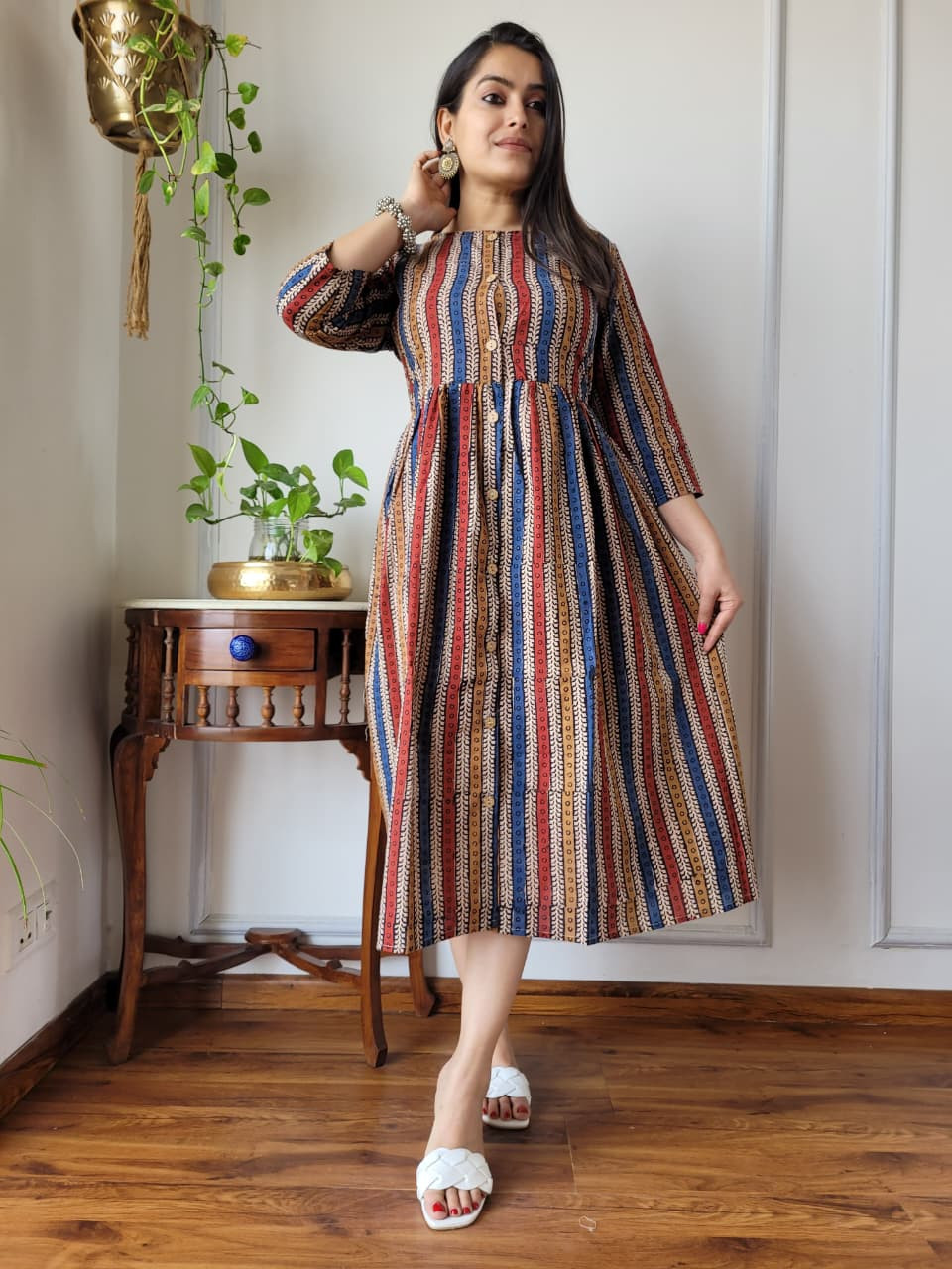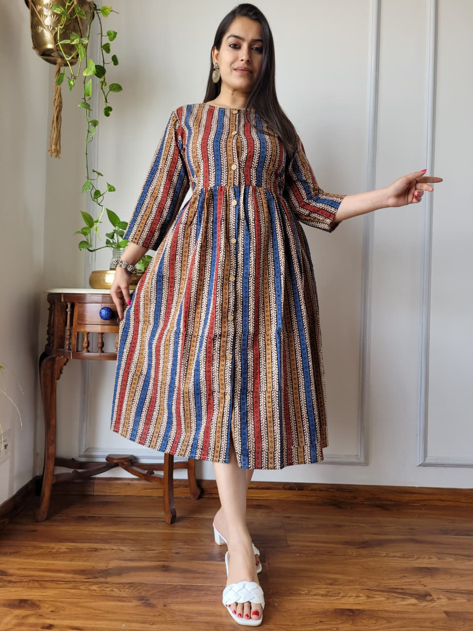 This multicolor striped cotton A-line one-piece dress is a vibrant and comfortable garment that effortlessly blends traditional Indian textile artistry with a modern, flattering silhouette. Crafted from high-quality, breathable cotton cambric fabric, it offers a soft, lightweight feel, ensuring maximum comfort for all-day wear. The base features vertical stripes in multiple colors, including red, blue, mustard yellow, and beige/white, creating a dynamic and eye-catching pattern.
