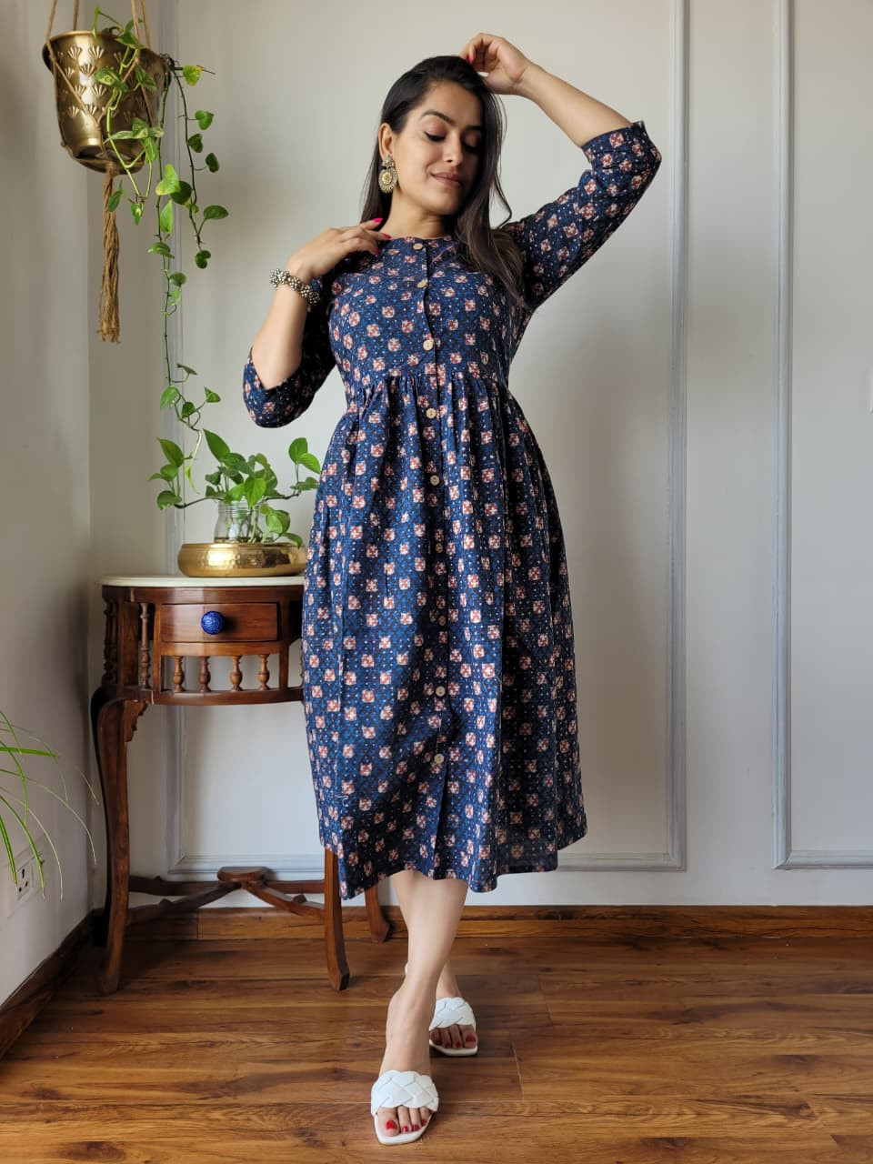 This navy blue and pink/white floral print cotton A-line dress is an elegant and comfortable garment that effortlessly blends a classic color palette with a modern, flattering silhouette. Crafted from high-quality, breathable cotton cambric fabric, it offers a soft, lightweight feel, ensuring maximum comfort for all-day wear. The dress features a deep navy blue base color adorned with intricate small floral motifs in shades of pink and white. These patterns are often applied using traditional hand block printing techniques, giving the garment an authentic, artisanal touch. The design follows a flattering A-line silhouette, fitted at the bodice and flaring out gently toward the hem, providing graceful movement and a relaxed fit. Key design details include a classic round neckline, a functional partial front button placket closure, and three-quarter length sleeves.