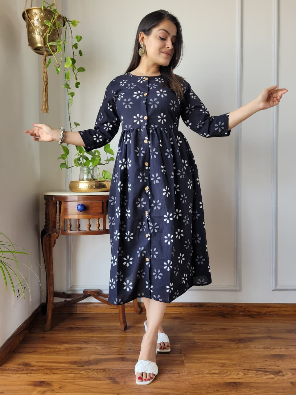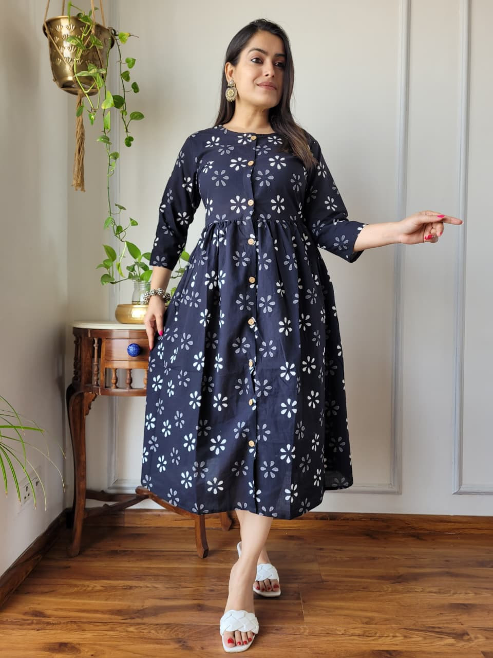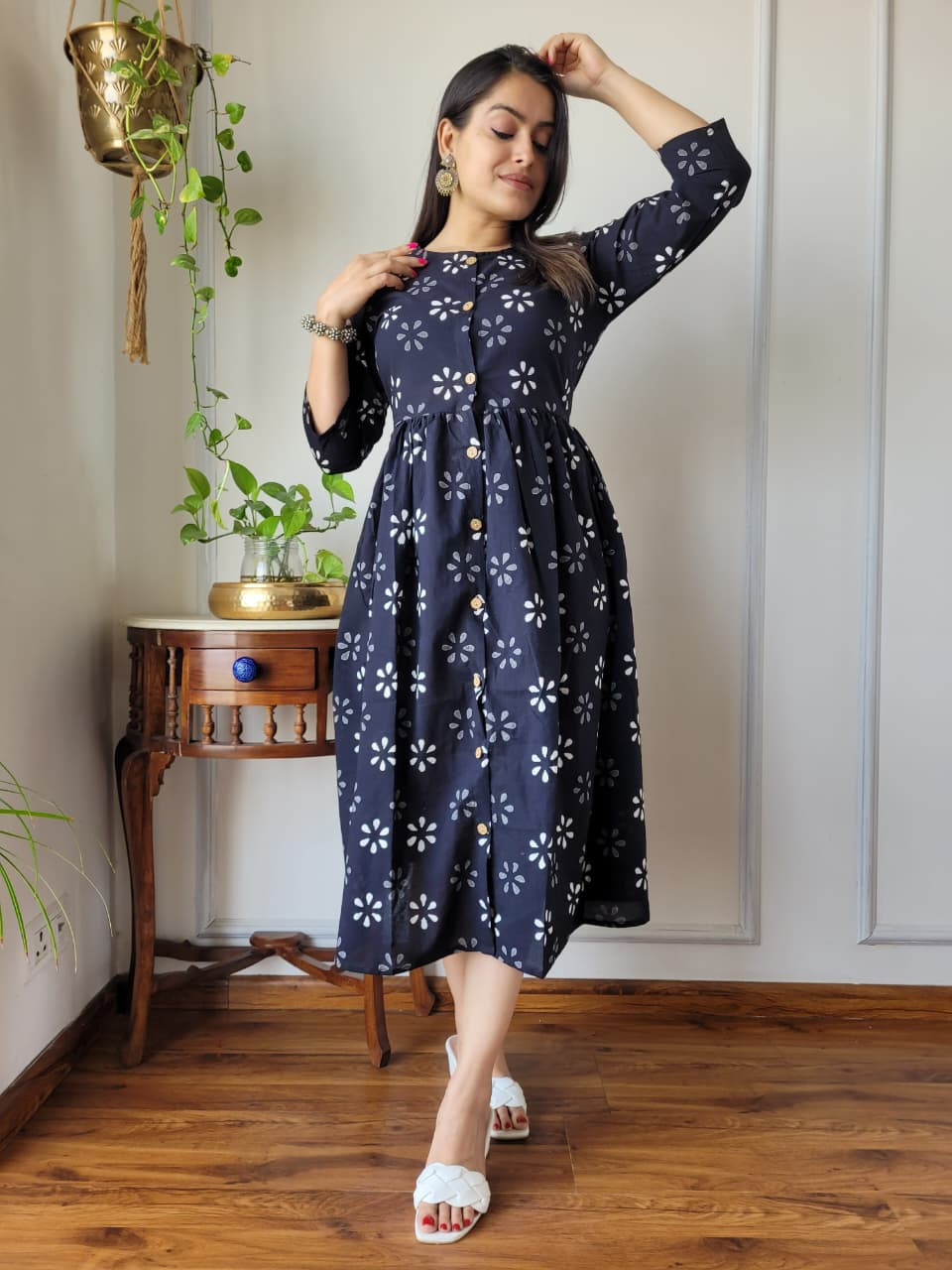 The dress features a deep navy blue base color adorned with striking white (or off-white) floral and botanical motifs. This classic combination creates a sophisticated visual appeal suitable for various occasions. The design is an A-line silhouette, meaning it is fitted through the bodice and then flares out gently towards the hem