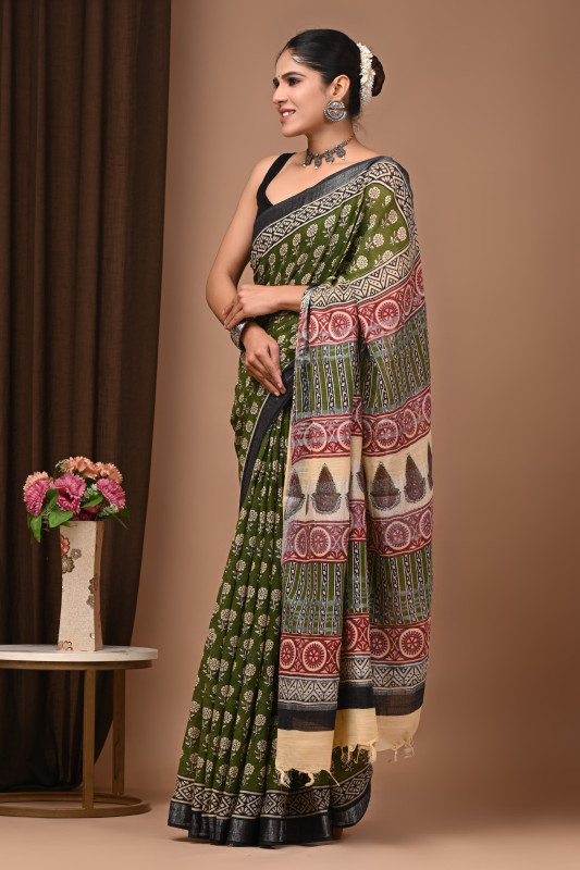 This Olive Green and Multicolor Hand Block Printed Cotton Saree with Black Border and Patterned Pallu is a beautiful blend of traditional artistry and modern elegance, crafted to bring effortless charm to your wardrobe. Made from soft, breathable cotton, the saree drapes gracefully and offers all-day comfort, making it perfect for both daily wear and special occasions. The rich olive green base is adorned with intricate hand block prints that reflect the skill and heritage of artisan craftsmanship, giving the saree a unique, authentic appeal. The striking black border adds definition and contrast, enhancing the overall sophistication of the look. The highlight of the saree is its vibrant multicolor patterned pallu, featuring detailed motifs and ethnic designs that add depth, color, and cultural richness. Whether paired with oxidized jewelry for a traditional touch or minimal accessories for a contemporary look, this saree effortlessly elevates your style with its blend of elegance, comfort, and handcrafted beauty. It is a timeless piece that celebrates the essence of Indian textile tradition while offering a refined, stylish presence for any occasion.