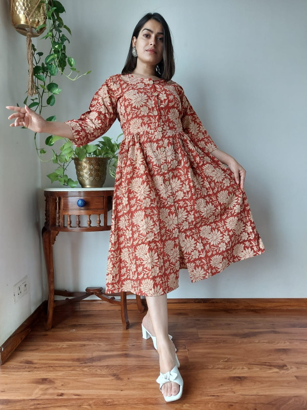 This rust orange hand block print cotton one piece dress is a captivating and comfortable garment crafted from lightweight, breathable cotton cambric fabric. It features a rich terracotta base color adorned with intricate, hand-carved block prints in a contrasting cream floral pattern, a technique deeply rooted in the traditional artistry of Bagru, Rajasthan. The dress is designed with a flattering A-line or paneled silhouette that gently gathers at the waist, offering a relaxed yet elegant fit. Key design elements include a sophisticated mandarin collar, a practical partial front button placket, and three-quarter length sleeves. Furthermore, the functional design often incorporates convenient side pockets, combining style with practicality, while each unique piece highlights the rich cultural heritage and skilled craftsmanship of Indian artisans.