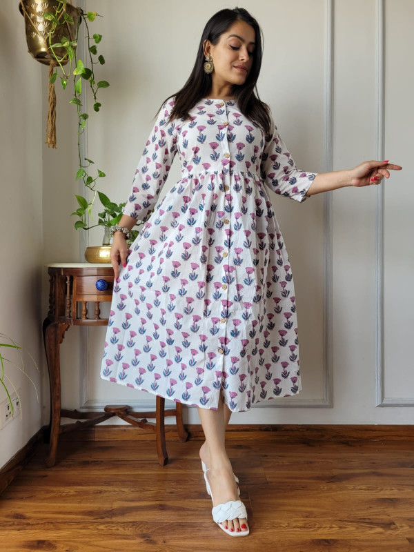 This white and pink floral hand block printed cotton A-line one piece dress is a charming and comfortable garment that effortlessly combines traditional Indian craftsmanship with a modern, flattering silhouette. Crafted from premium, breathable cotton cambric fabric, the dress offers a soft, lightweight feel, ensuring maximum comfort for all-day wear. The base color is a crisp white, adorned with intricate floral and botanical motifs in shades of pink and a subtle hint of blue/green for the leaves. These patterns are created using the time-honored hand block printing technique, a traditional artisan process that gives the garment an authentic, artisanal touch and connects it to the rich textile heritage of regions like Rajasthan. The design follows a flattering A-line silhouette, meaning it is fitted at the bodice and flares out gently toward the hem, providing graceful movement and a relaxed yet elegant fit. Key design details include a classic round neckline, a functional partial front button placket closure with contrast buttons, and three-quarter length sleeves. Many similar styles also incorporate convenient side pockets for added practicality. This versatile cotton dress is ideal for a variety of settings, from casual outings and brunches to office wear or evening gatherings, offering both elegance and ease.