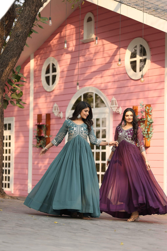 Wine Faux Georgette Embroidered and Sequins Work Designer Anarkali Gown, designed to make a lasting impression at any special occasion. The gown is crafted from premium-quality faux georgette fabric, known for its lightweight and ethereal drape that flows beautifully and moves gracefully with every step, lined with soft micro cotton for comfort. The rich, deep wine hue provides a sophisticated backdrop for the intricate craftsmanship, with the bodice and sleeves featuring detailed embroidery work with shimmering sequins and silver thread, strategically placed to catch the light and add a touch of glamour and luxury. The Anarkali silhouette boasts a generous flare, enhancing its regal look. This ensemble is a perfect choice for various events, including festive celebrations, weddings, receptions, and evening parties, and often comes complete with a matching faux georgette dupatta featuring coordinating work, ensuring you stand out with timeless beauty and grace